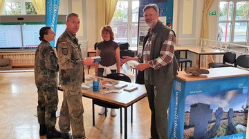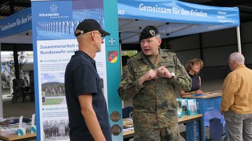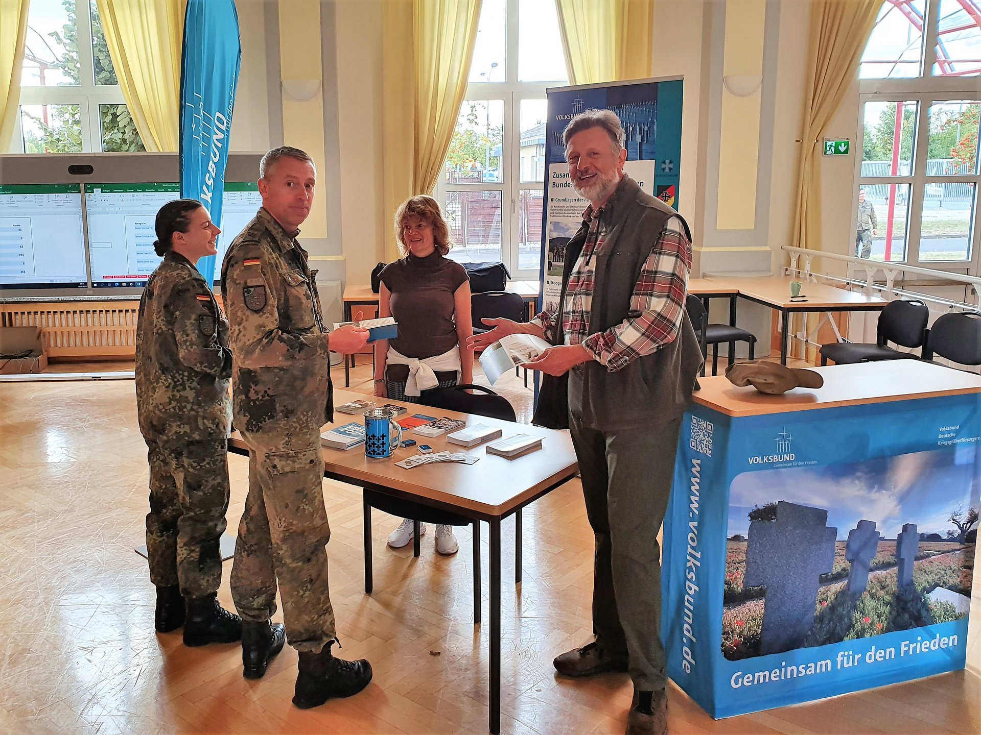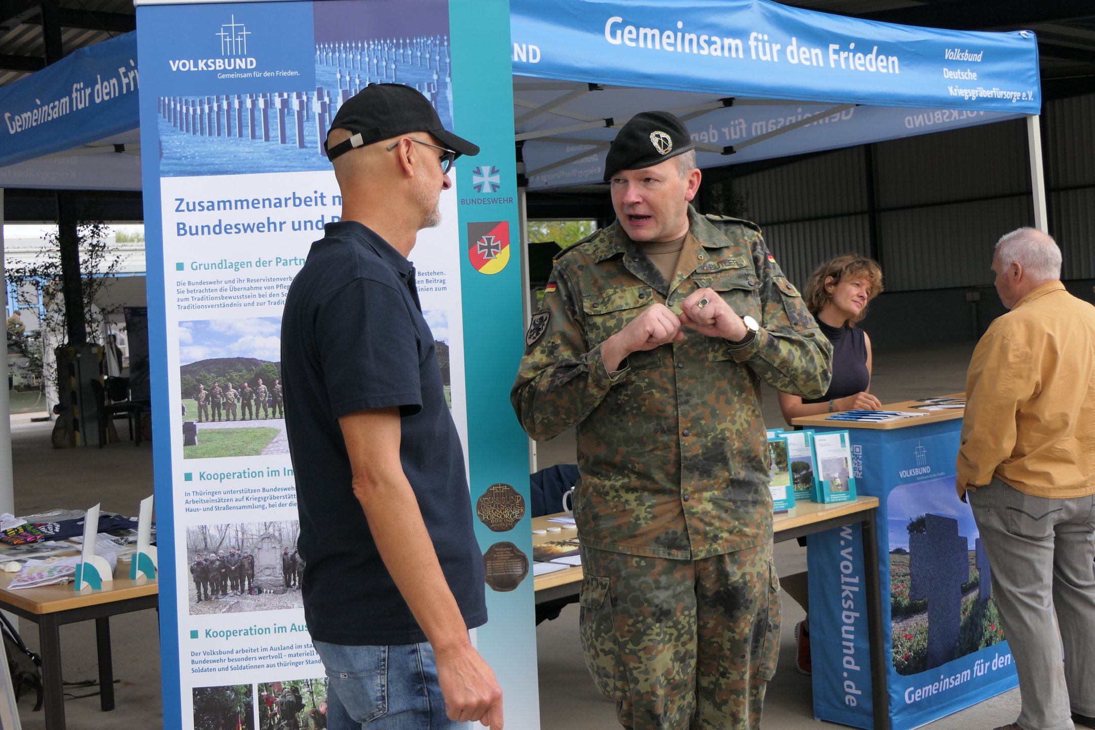 Beim Tag der offenen Tür in Bad Salzungen kamen wir an unserem Info-Stand u.a. mit General Ruprecht von Butler, Kommandeur 10. Panzerdivision in Veitshöchheim, ins Gespräch. Er ist Volksbund-Mitglied und auch wegen Kriegsverlusten in seiner Familie engagierter Förderer unserer Arbeit.